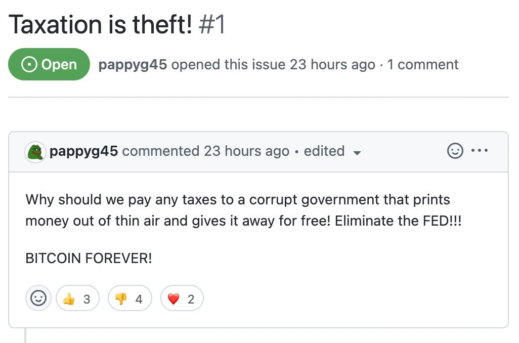 Molly White On Twitter Senators Lummis And Gillibrand Put The Text Of Their Proposed Crypto Legislation On Github And The First Comment Is From A Person With A Pepe Avatar Writing Taxation